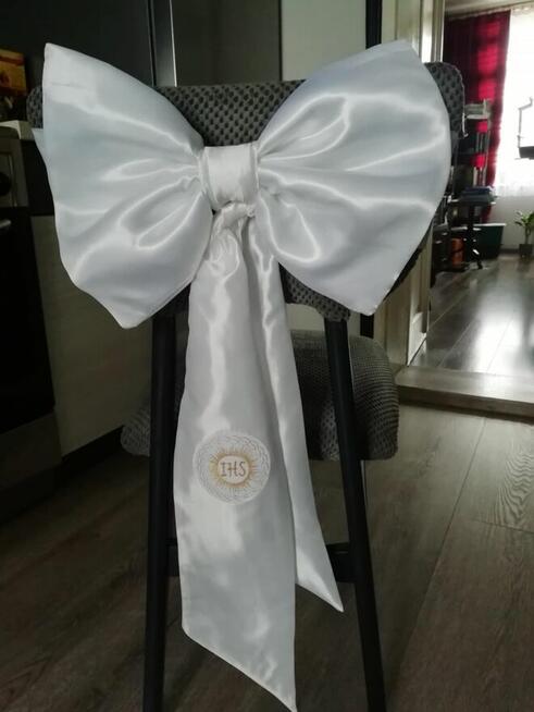 Witam zapraszam do zakupu dekoracyjnej na krzesło , białej, atłasowej Kokardy "Uniwersalna szarfa" – pasuje na krzesła ...